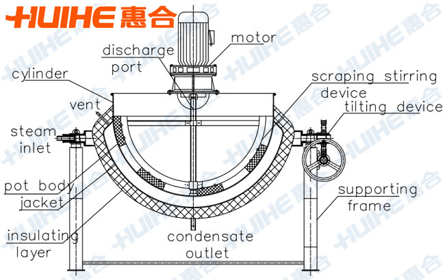 Tilting steam heating jacketed kettle with agitator has been widely applied in food processing such as candy, medicine, dairy, alcohol, cake, beverage, sweetmeat, can, etc. Some large restaurants and canteens also use it to boil soup, cook, stew and porridge. It is considered to be the ideal equipment in the area of improving quality, shortening the time and improving working conditions.