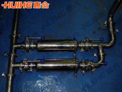 1, The pipe double filter is composed of two cylinders, inside and outside surfaces are mirror polished, the top is equipped with pressure gauge and air exhaust valve. Pipe joints adopt expansion connection. By 1.0MPa hydrostatic test, the tee male cock flexible for opening and closing. Internal filter is the basket made by punching board, which supports the liquid filter bag. The liquid flows through filter bag and impurity is intercepted in, filter bag can change and clean.