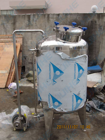 2) 連續(xù)式發(fā)酵法:是指投料、出酒能連續(xù)化。首次投料時(shí),加入培養(yǎng)酒母20-30%,投料部位達(dá)到皮渣分離器的下端。發(fā)酵約4天即可進(jìn)行連續(xù)發(fā)酵。投入的料按15-20克/100升加入二氧化硫。連續(xù)發(fā)酵后,每日定時(shí)定量放出發(fā)酵酒并投料,投料時(shí)打開(kāi)出酒閥使發(fā)酵酒自由流出。在投料和出酒的同時(shí),開(kāi)動(dòng)螺旋推進(jìn)器將皮渣經(jīng)漏斗流入皮渣壓榨機(jī)分離酒液。發(fā)酵結(jié)束后可將出酒閥門關(guān)閉,打入已發(fā)酵結(jié)束的酒將皮渣頂出。罐內(nèi)溫度要保持在28-30℃,以利發(fā)酵正常進(jìn)行。